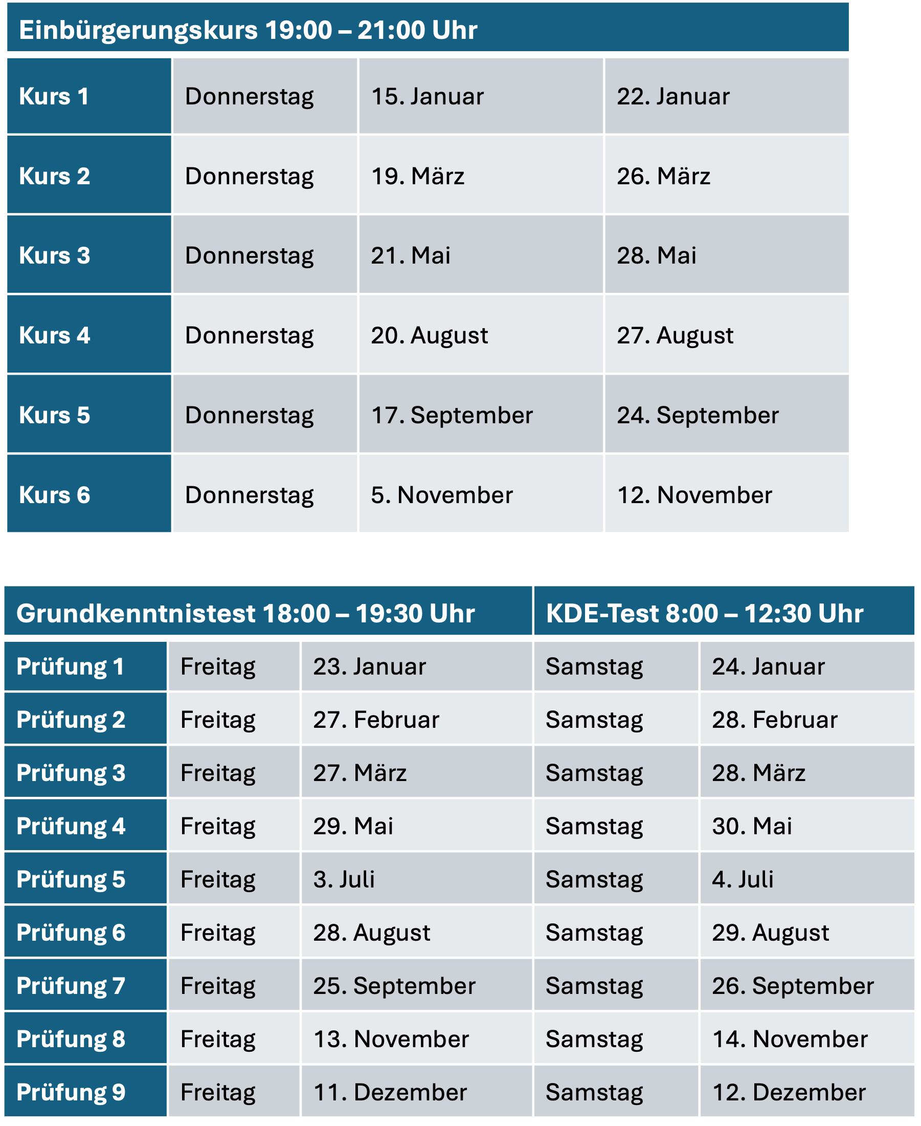 Die KDE-Prüfungen (schriftlich) starten am Samstagmorgen um 8:30 Uhr. Die mündlichen Prüfungen werden ab 10:00 Uhr durchgeführt.